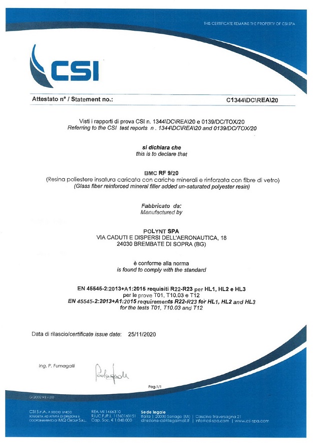 La massa poliestere “BMC RF 3/20”, forniti da Polmix SPA, e “BMC RF 9/20”, forniti da Polynt SPA, con cui sono realizzati tutti gli isolatori da noi prodotti, sono conformi alla norma EN 45545-2 che specifica i requisiti di comportamento al fuoco dei materiali e dei componenti utilizzati nei veicoli ferroviari.